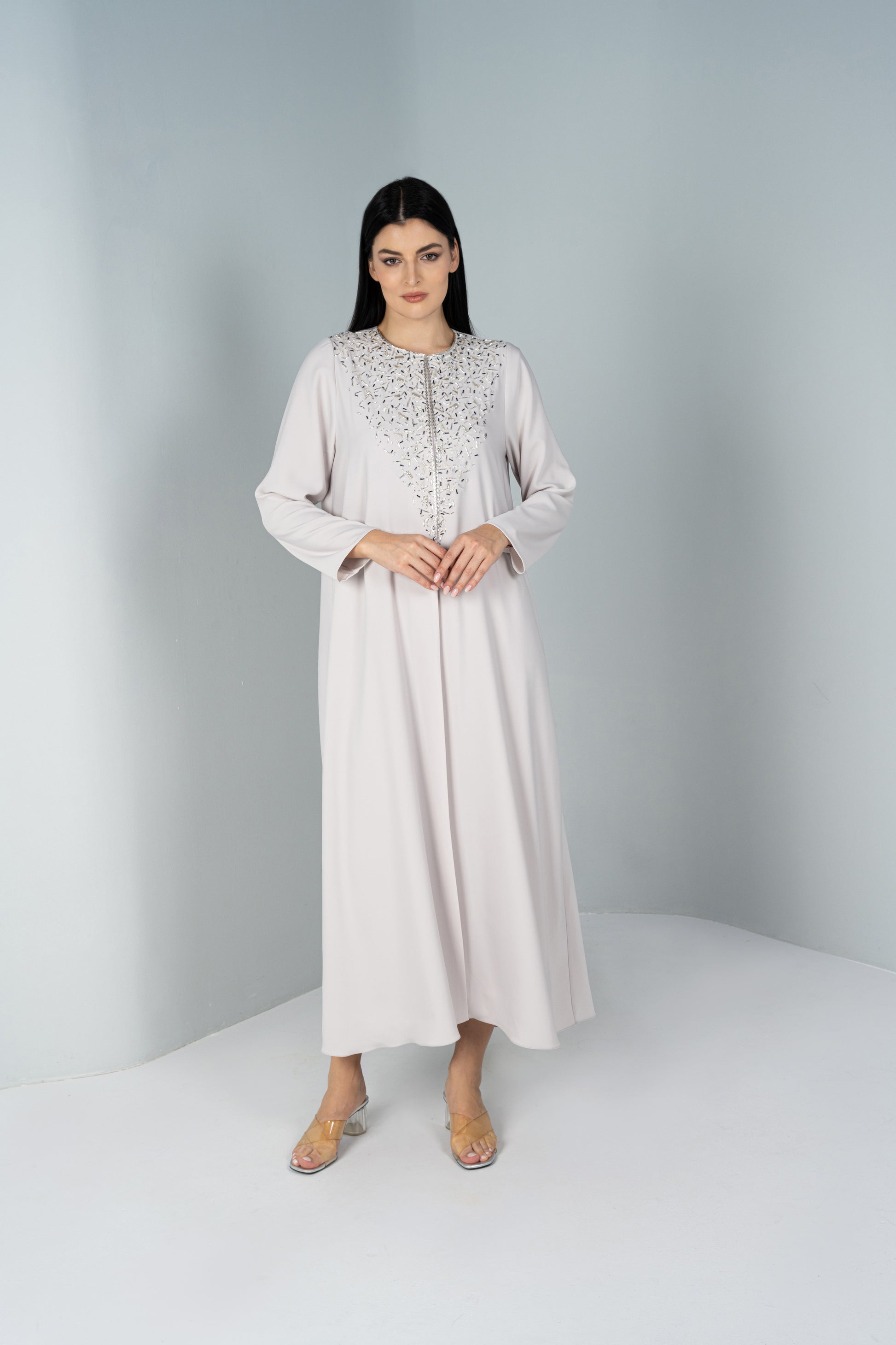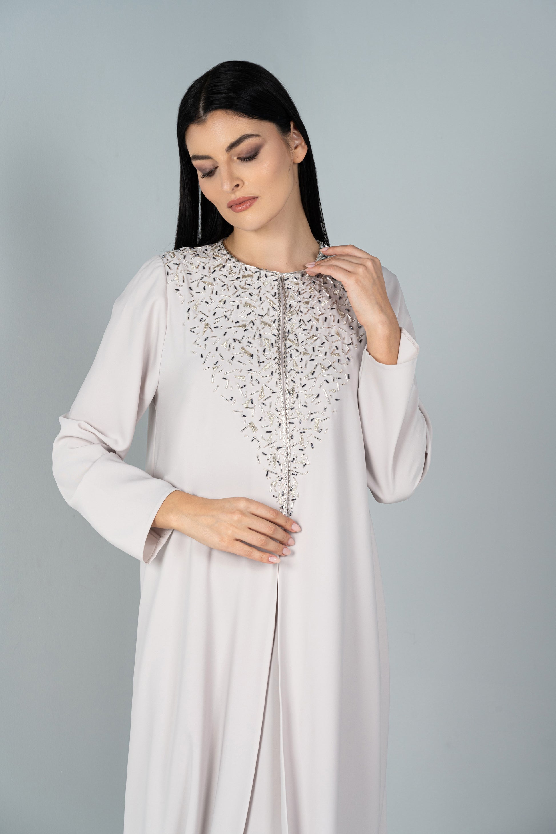 Modern Arabia is a piece that made Arabian culture into something a little more modern. it comes with an under the abaya. There is a triangle shape starting from the collar down to the chest that has crystals. There is also has a transparent snap button on the Abaya to close it.