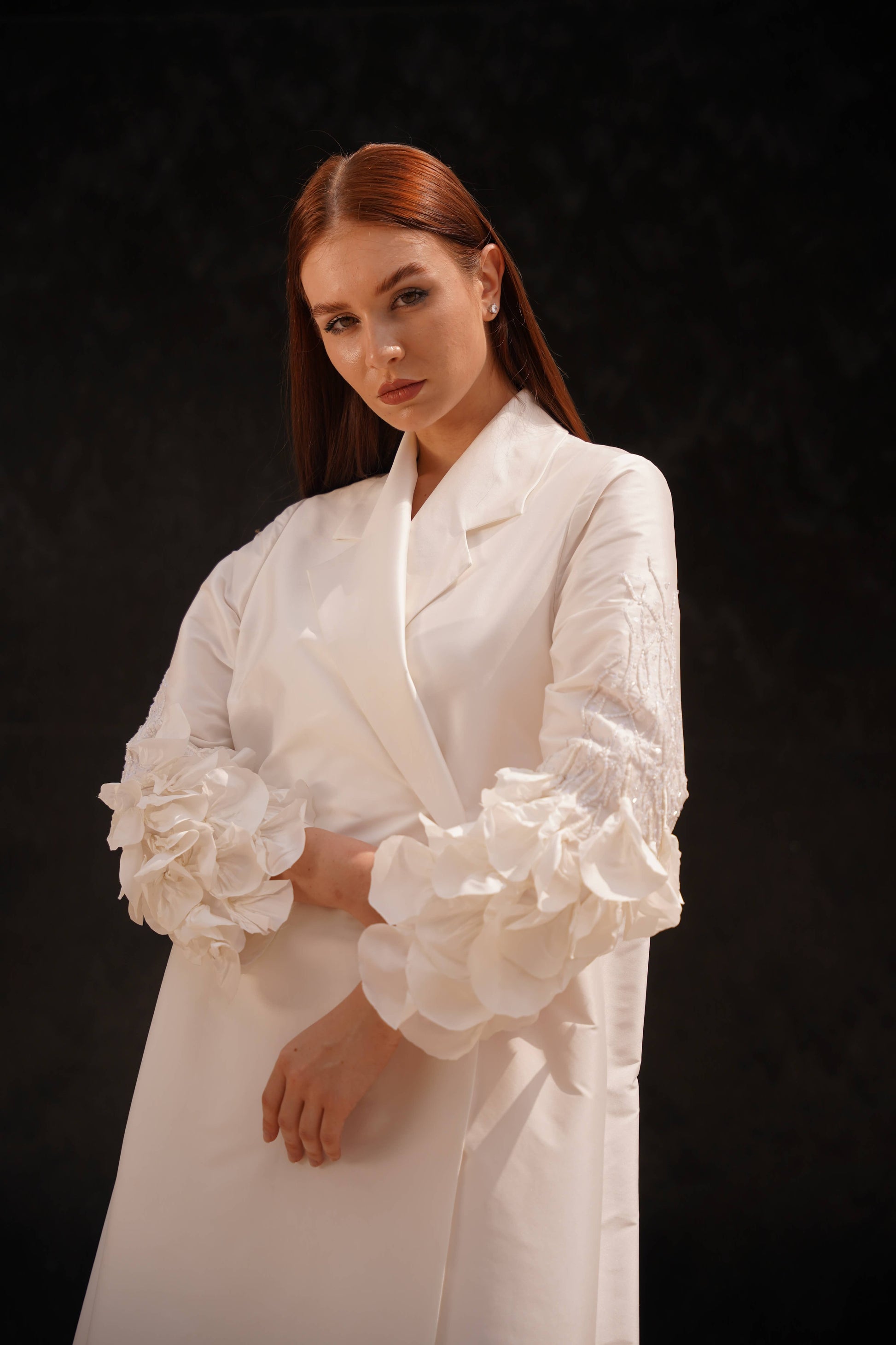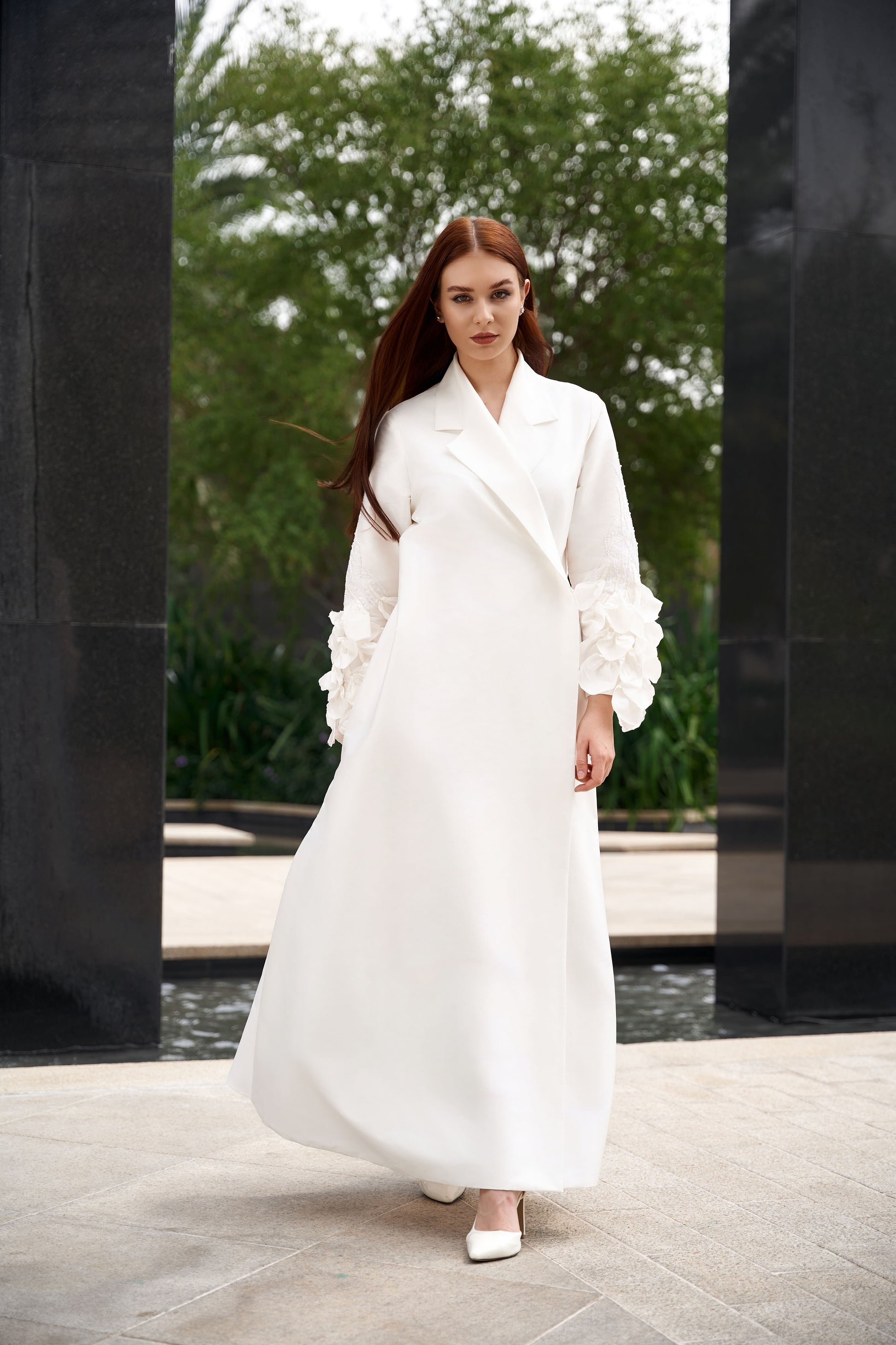 White silk taffeta fabric abaya jacket style. Sleeves designed by hand made leaves and hand work of silk thread ,crystals & beads.