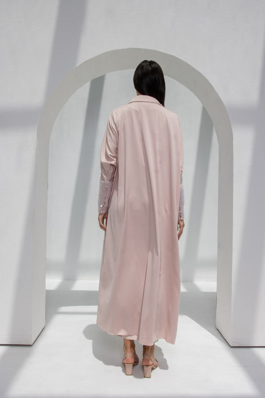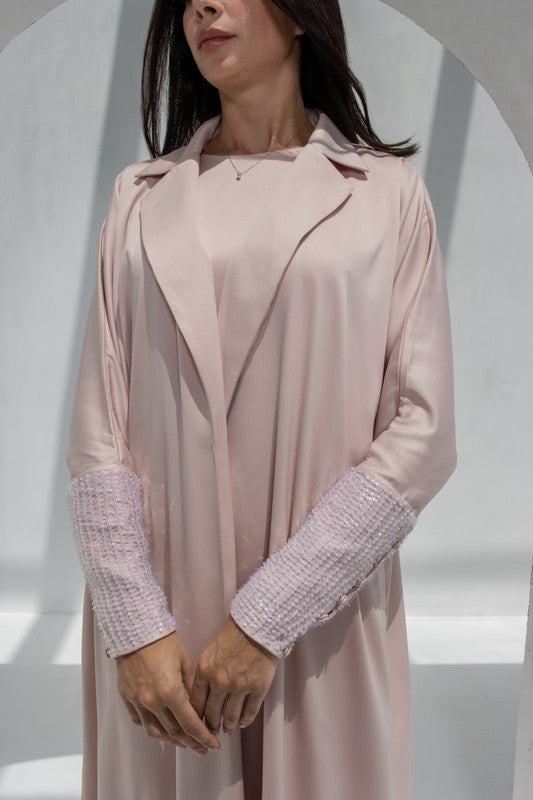 Lily is a simple two-piece abaya that has a suit jacket collar. The Sleeves have a mix of glass crystal beads and sequence. There are buttons on the side of the Sleeves to adjust the Sleeves tightness.