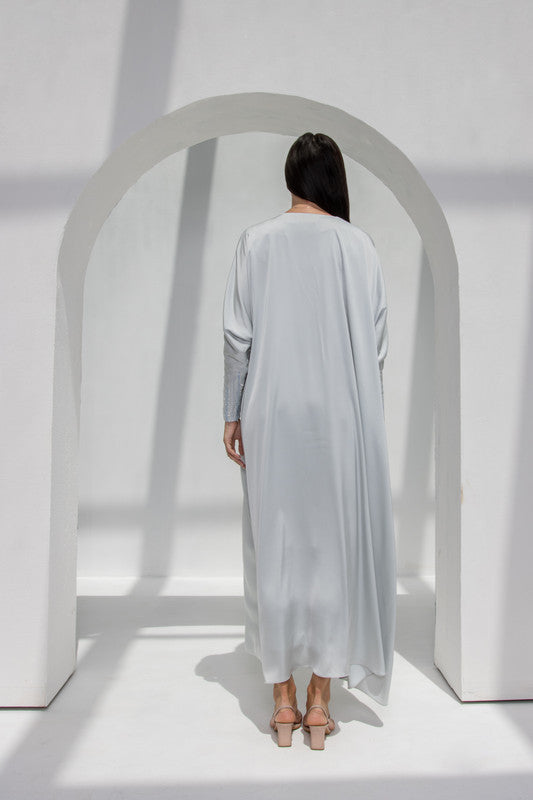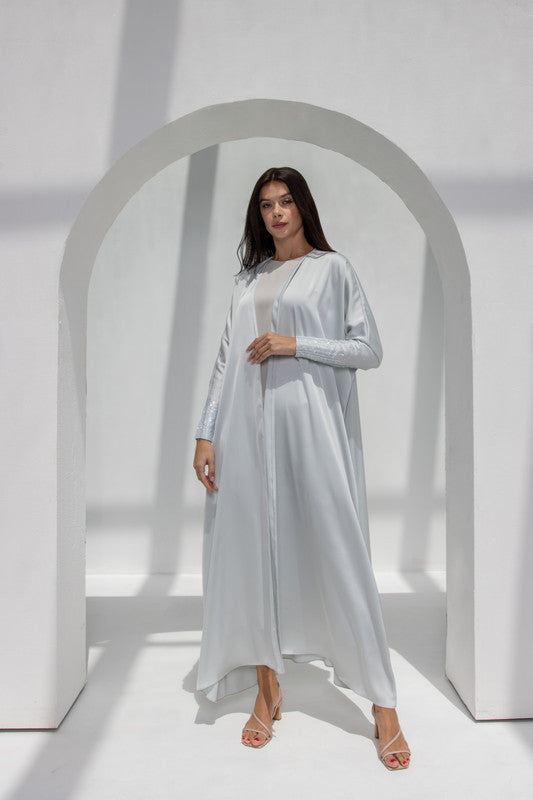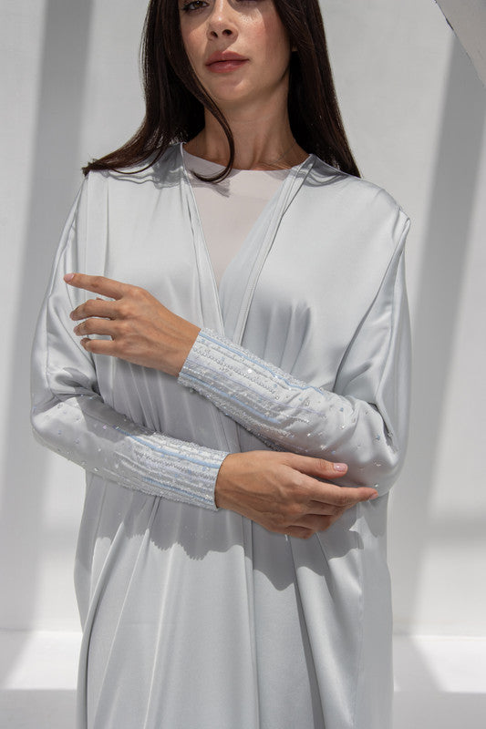 Lily is a simple two-piece abaya that has a suit jacket collar. The Sleeves have a mix of glass crystal beads and sequence. There are buttons on the side of the Sleeves to adjust the Sleeves tightness.