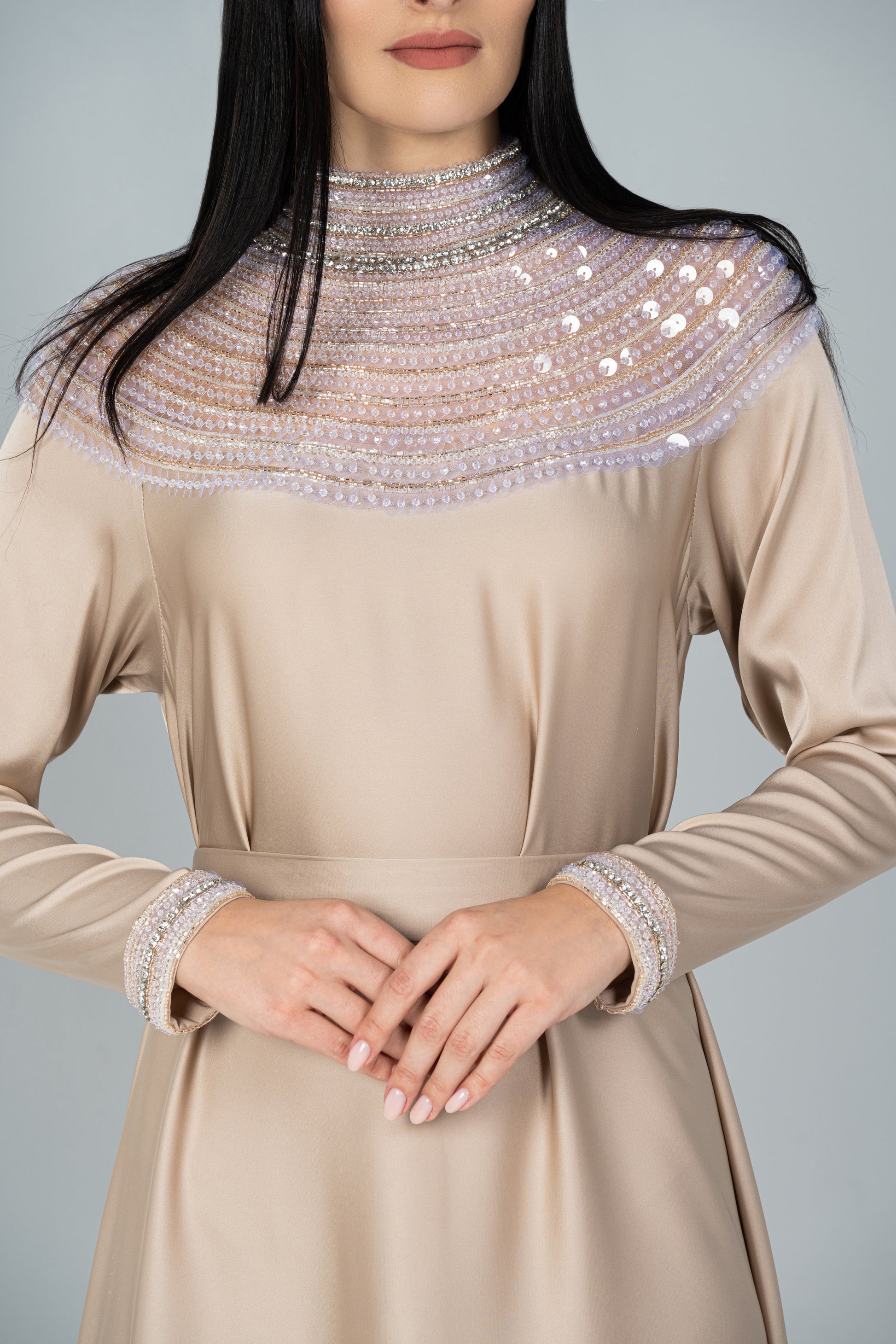 • Crystal, bead, and sequin beading on the collar
