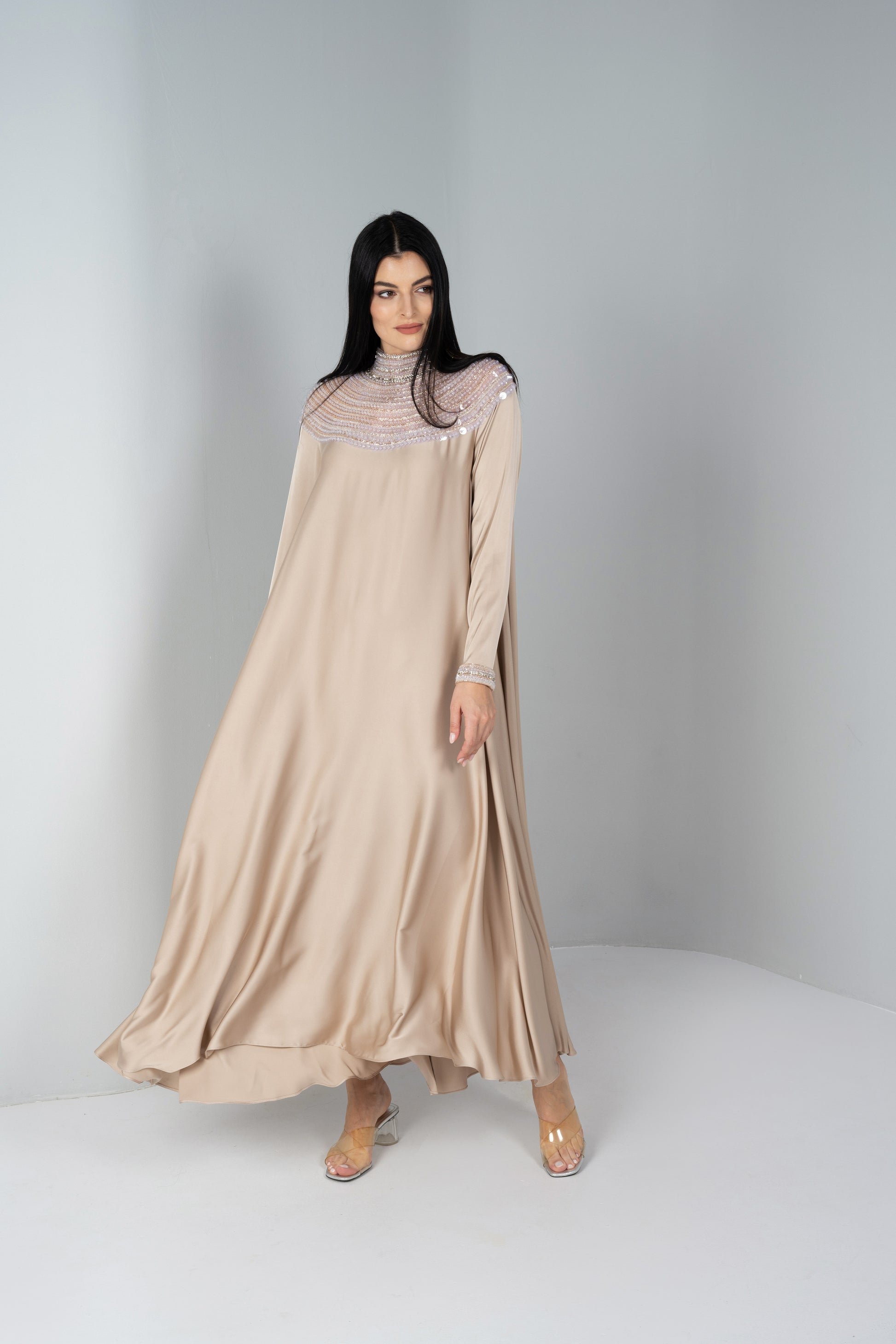 Desert is a stunning silk dress with a high neck collar that is laced with crystals, beads and sequins. It's comes with a belt that is can be worn to snatch the waist.
