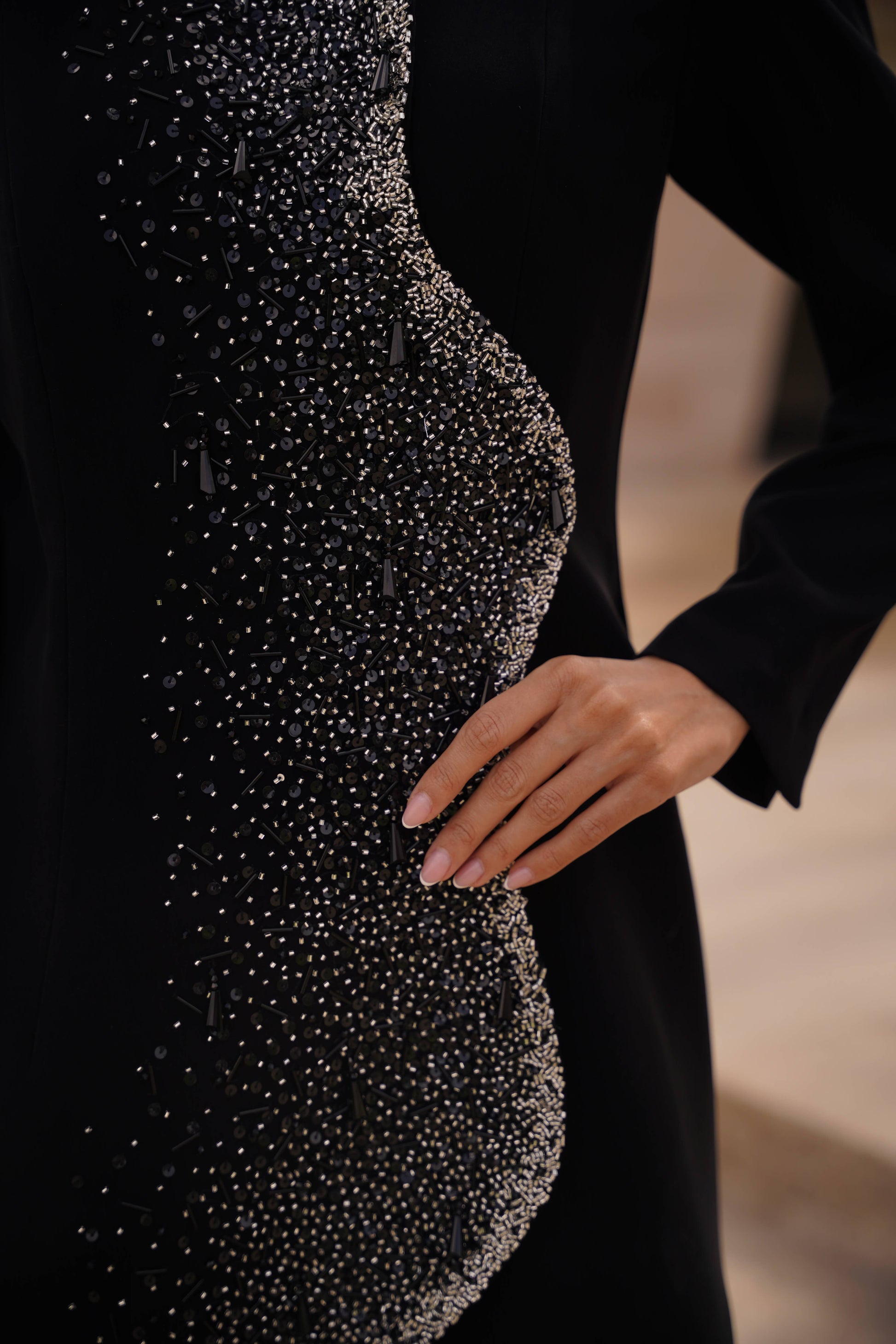 Unique and luxury jacket design, made of black high quality crepe fabric . Wavy design on front opening , havy hand beaded work of black and silver crystals and beeds.