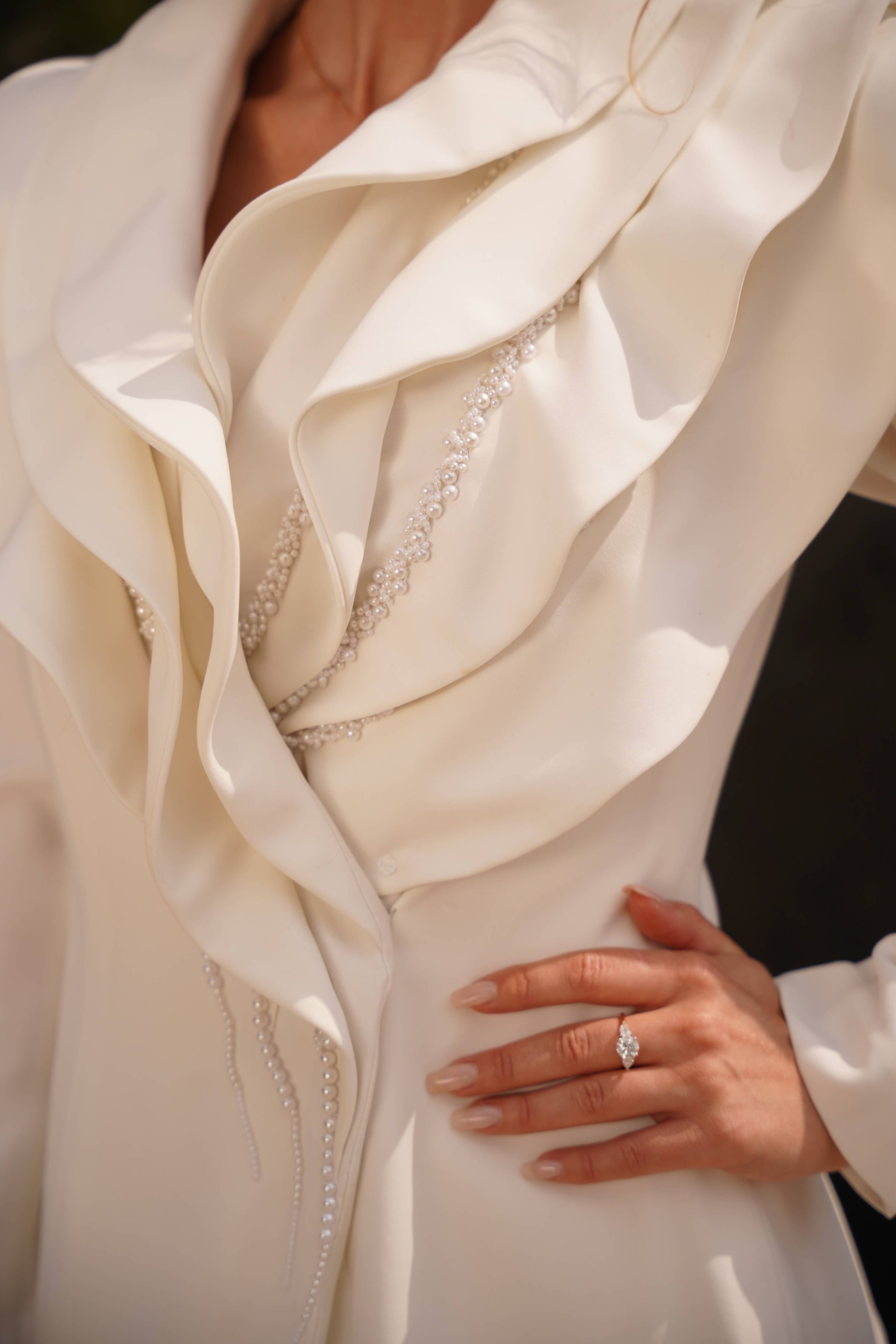 A classic white high quality crepe jacket , straight cut style . The shoulders designed by create tailored ruffles .luxury hand work design of white pearls between the ruffles.